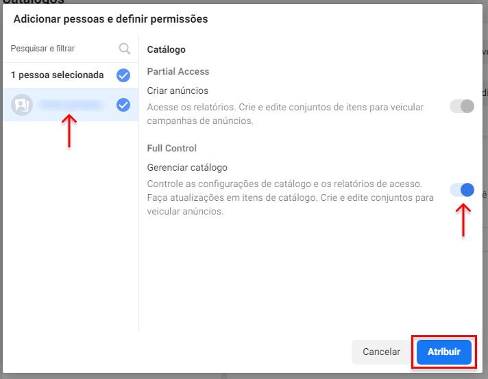 4. Escolha o usuário que irá gerenciar o catálogo e habilite a opção de controle total. Depois clique em Atribuir.