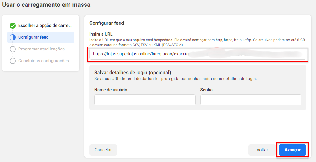 9. Volte no gerenciador de comércio do Facebook e cole o link no campo indicado, depois clique em Avançar.