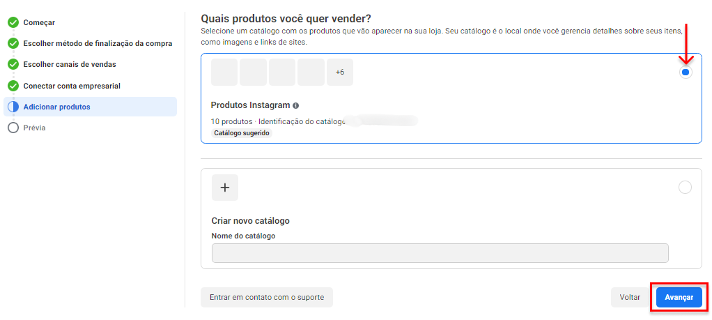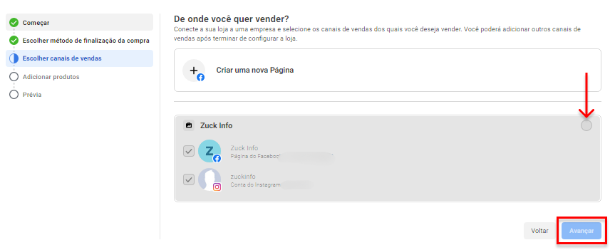 4. Escolha as página que você quer mostrar os seus produtos e clique em Avançar..