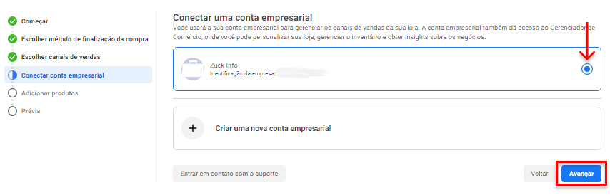 5. Defina a conta comercial que será usada para gerenciar a loja e clique em Avançar..